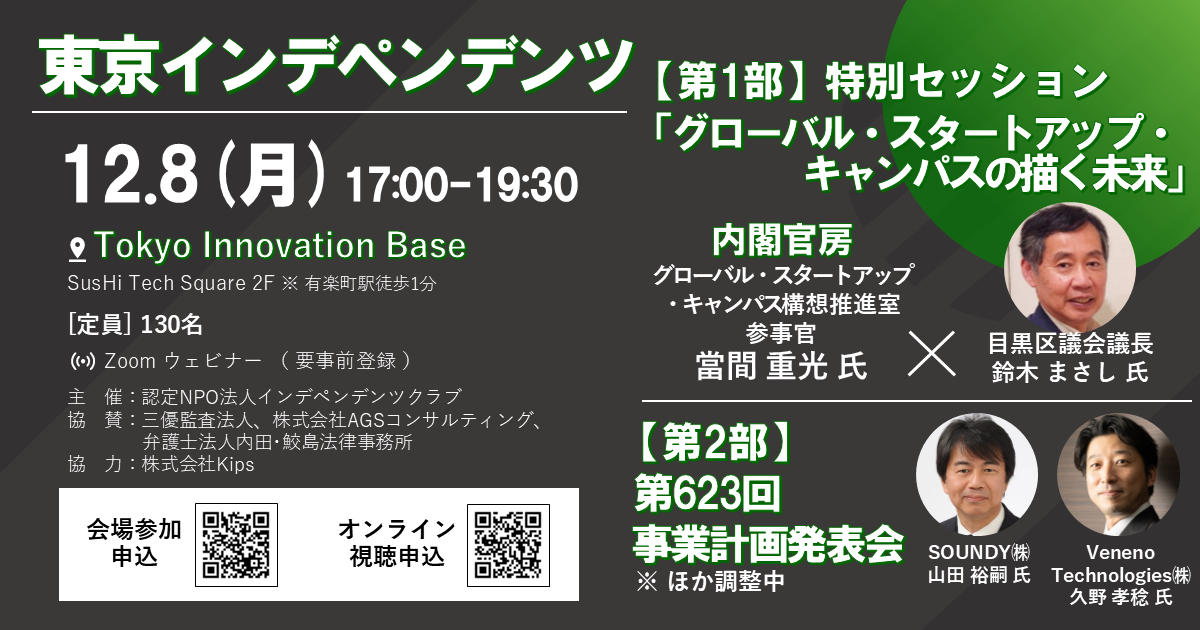 ■ 東京インデペンデンツクラブ(2025年12月8日開催)では「グローバル・スタートアップ・キャンパスの描く未来」をテーマに特別セッションを行います。オフライン・オンラインともにどなたでもご参加できます。